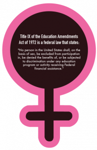 Over the past 45 years, Title IX of the Education Amendments of 1972 has been known for its goal of striving for equality in athletics. This federal law provides protection from sex discrimination in educational programs. Title IX covers classes, student organizations, athletic departments and other public groups. It says “No person in the United States shall, on the basis of sex, be excluded from participation in, be denied the benefits of, or be subjected to discrimination under any education program or activity receiving… federal financial assistance.”