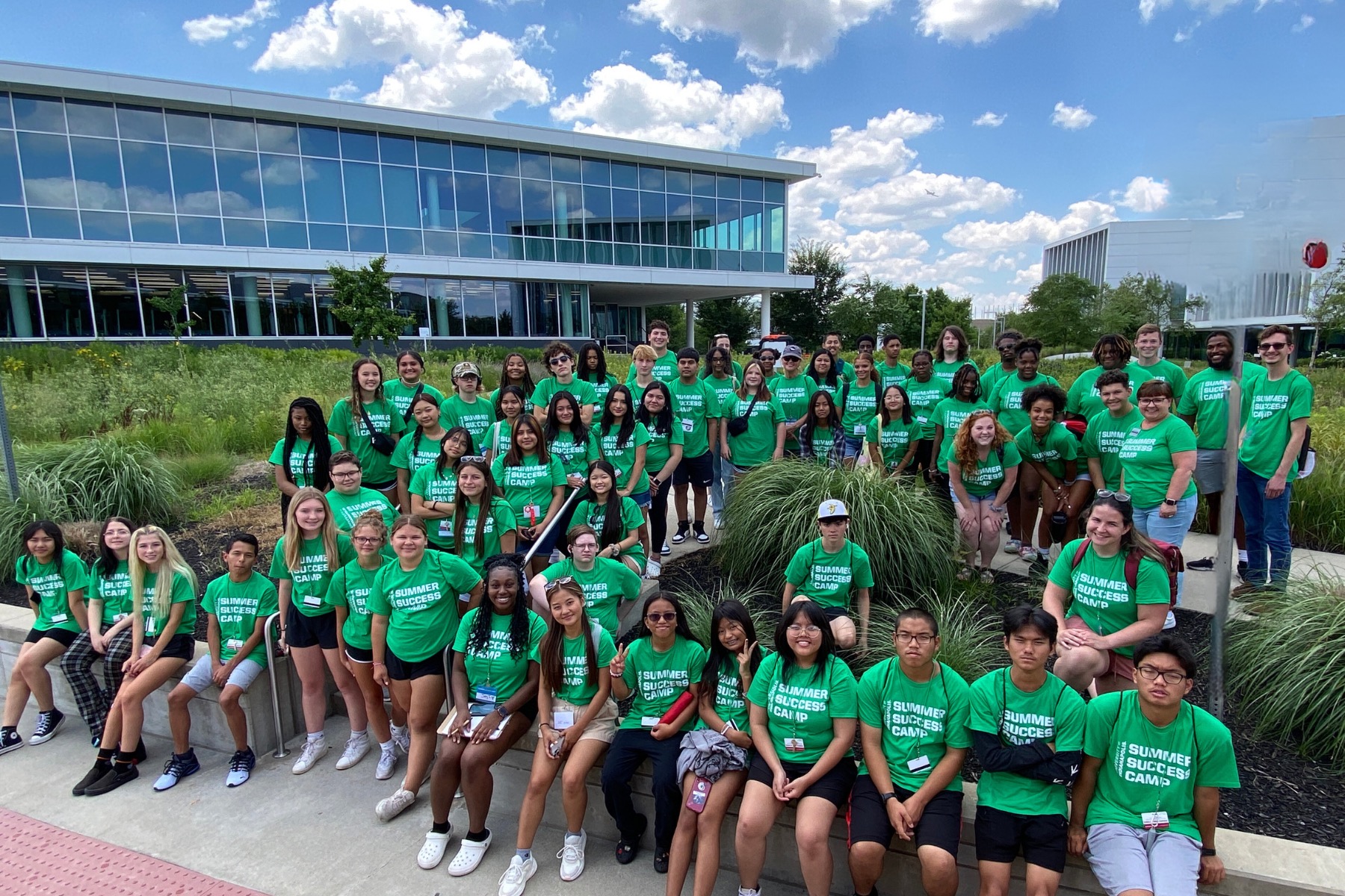 Group of students gathered outside in the snow to enjoy the holiday lighting
