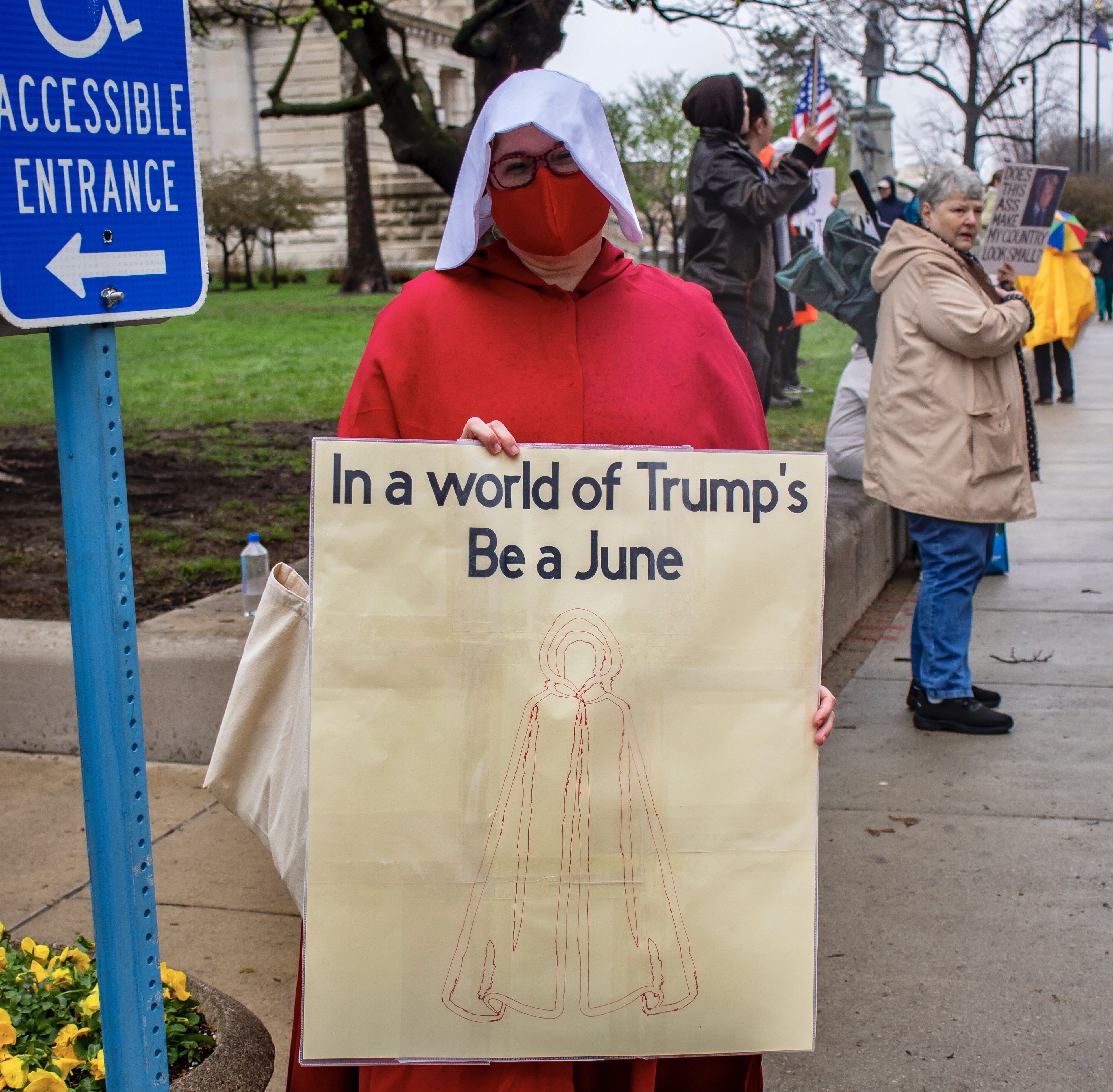 Photo by Mia Lehmkuhl Protestor Megan dressed in “The Handmaid’s Tale” attire holds up a sign at the 50501 Movement’s protest at the statehouse on April 5. Despite the rainy weather, Hundreds of hoosiers showed up to uphold The Constitution and speak their minds.