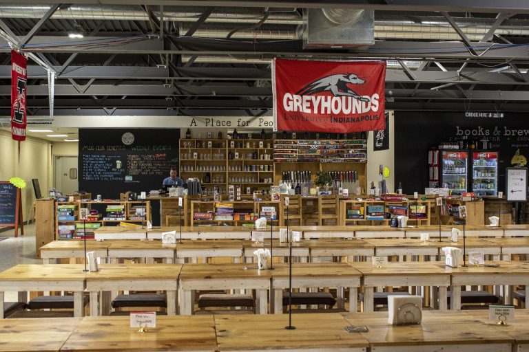 Several cars park outside of Books & Brews South Indy as students from the University of Indianapolis’...