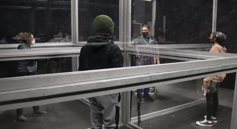 The curtain opens on the Speech for the Stage class. The setting is the black studio theatre...